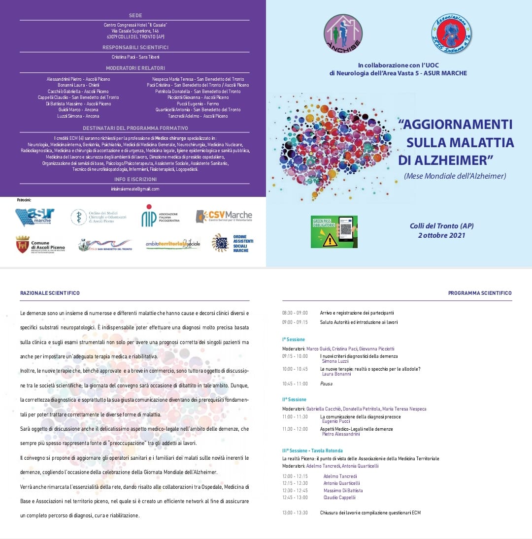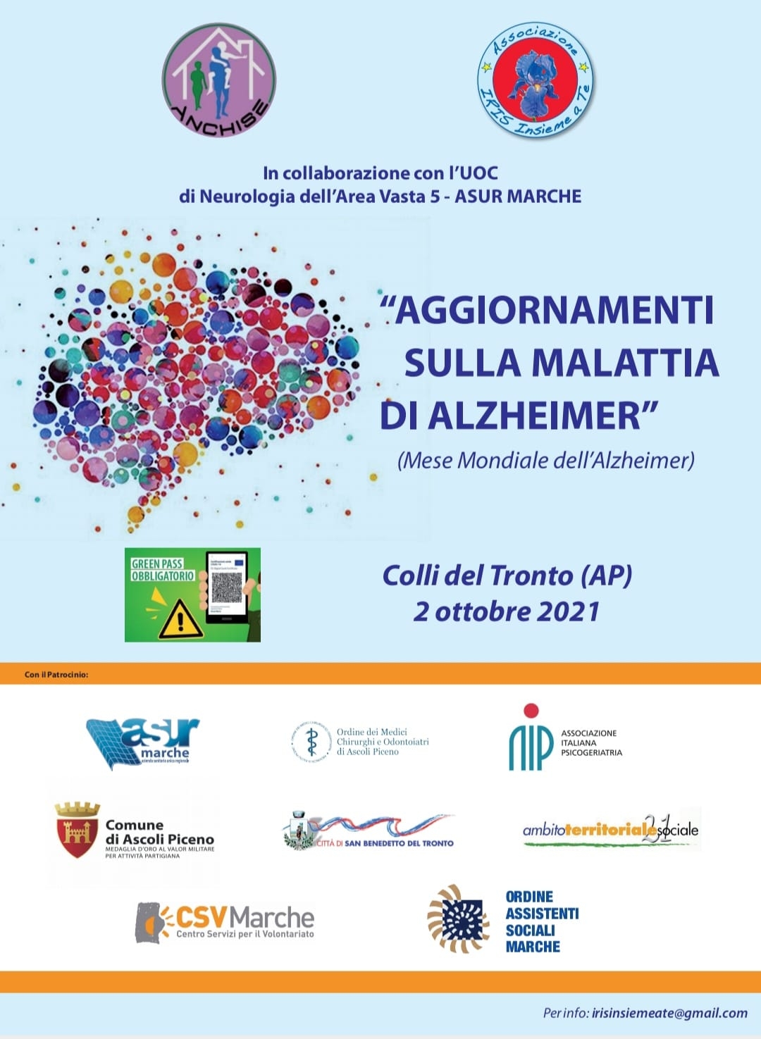 COLLI DEL TRONTO (Ap) – In occasione della Giornata Mondiale della Malattia di Alzheimer il 2 ottobre dalle ore 8,30 presso la Sala congressi dell’Hotel Casale di Colli del Tronto (AP) le Associazioni “Anchise” di Ascoli Piceno e “Iris insieme a te” di San Benedetto del Tronto , in collaborazione con l’UOC di Neurologia dell’ASUR MARCHE-Area Vasta 5 , organizzano il convegno “Aggiornamenti sulla Malattia di Alzheimer”. Per l’evento saranno presenti illustri relatori dell’Università di Chieti , della Clinica Neurologica di Torrette , nonché specialisti dell’ASUR MARCHE esperti del settore. Verranno trattate diverse tematiche , tra cui gli aspetti medico-legali, la dibattuta efficacia dei nuovi farmaci per la Malattia di Alzheimer, gli aspetti etici e della comunicazione e le caratteristiche cliniche della malattia. L’evento è patrocinato dall’ASUR MARCHE, I Comuni di Ascoli Piceno e San Benedetto del Tronto, L’ambito Territoriale Sociale 21, l’Ordine dei Medici di Ascoli Piceno, il Centro Servizi per il Volontariato, l’Associazione Italiana di Psico-Geriatria. Il Convegno è rivolto agli operatori sanitari del settore: medici, infermieri, psicologi, assistenti sociali, tecnici di neurofisiopatologia, assistenti sanitari, logopedisti e fisioterapisti. A causa delle restrizioni Covid l’evento sarà trasmesso anche in diretta su una piattaforma digitale. Per info mandare una mail a: irisinsiemeate@gmail.com