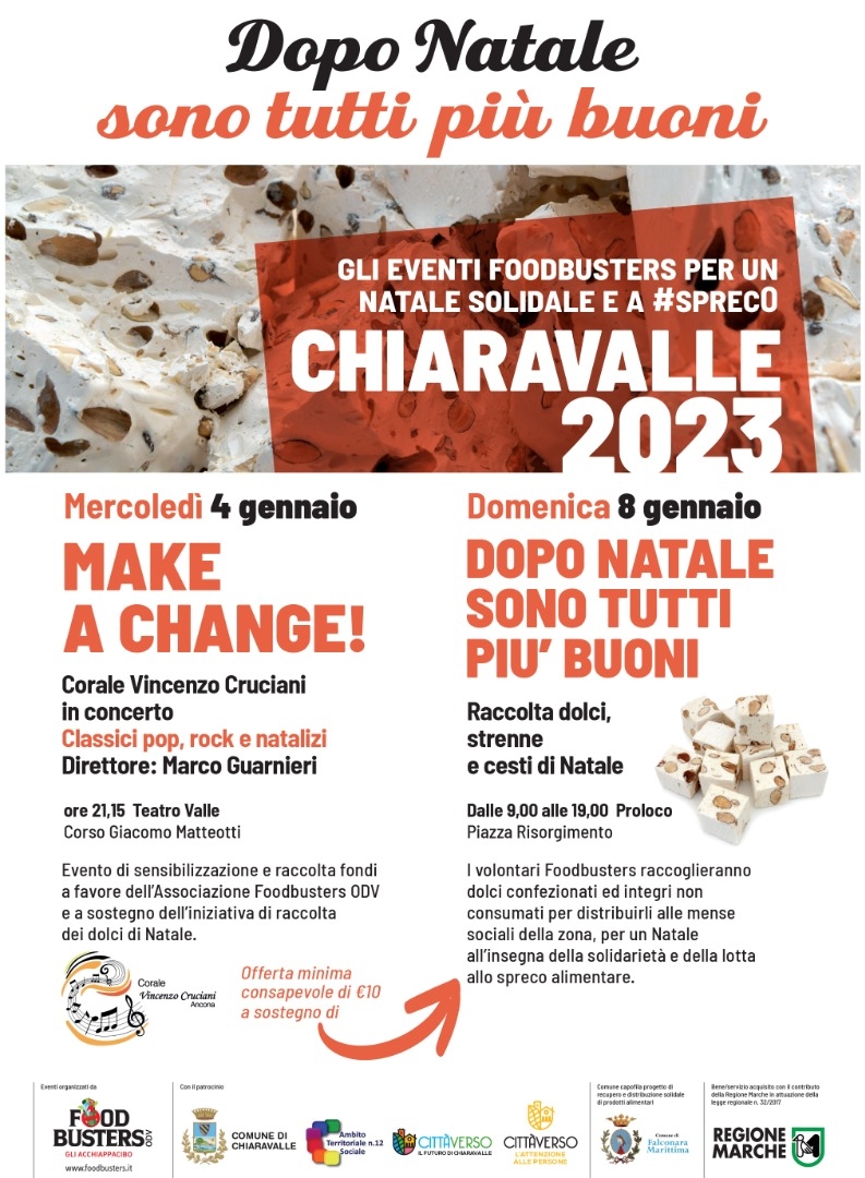 La giornata di solidarietà, dove i valori del consumo responsabile di cibo si uniscono alla filantropia, è preceduta da un evento di raccolta fondi in programma il 4 gennaio. Si tratta del concerto “Make a Change!” al Teatro Valle di Chiaravalle, ore 21.15, che andrà proprio a sostenere l’evento dell’8 gennaio “Dopo Natale sono tuti più buoni”. Il concerto è a cura della corale Vincenzo Cruciani, con i musicisti Corrado Baldini, Samuele Barchiesi, Roberto Gazzani, Antonio Spaziano. Direttore, Marco Guarnieri, con classici pop, rock e natalizi. L’offerta minima consapevole è di 10 euro.